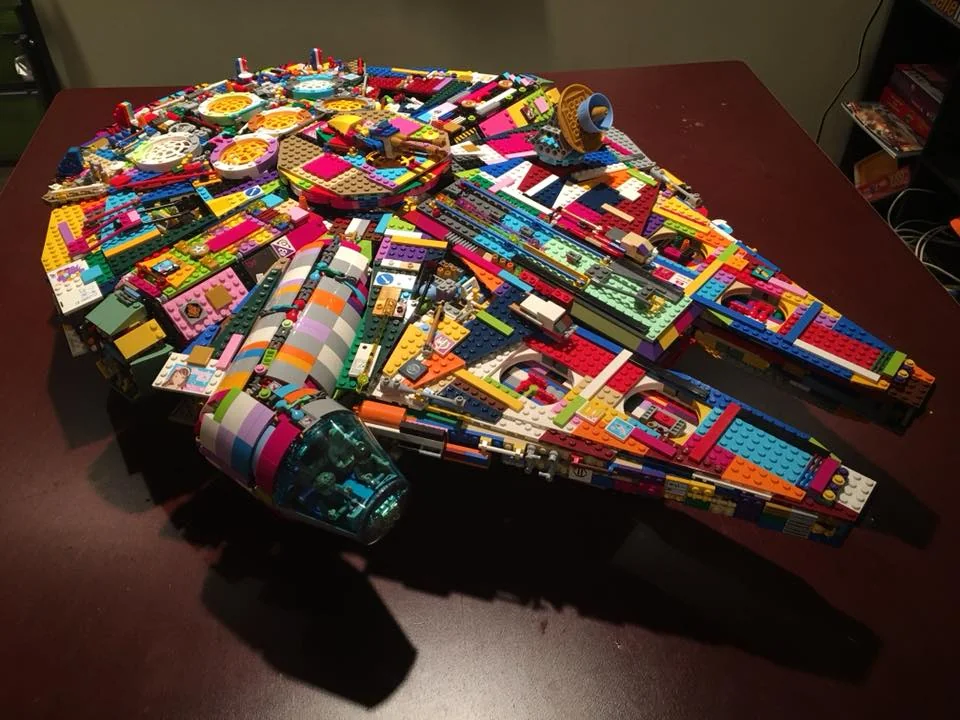 "After 8 months of collecting and building... My daughters “colorful” Lego UCS Millennium Falcon is done!"