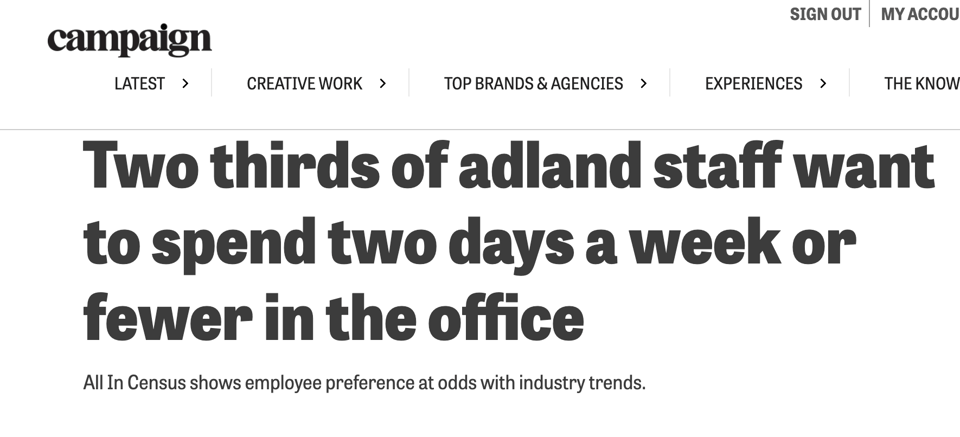 “The most popular weekly working pattern among adland employees is two days in the office with three remote, according to the latest analysis of the Advertising Association’s All In Census.