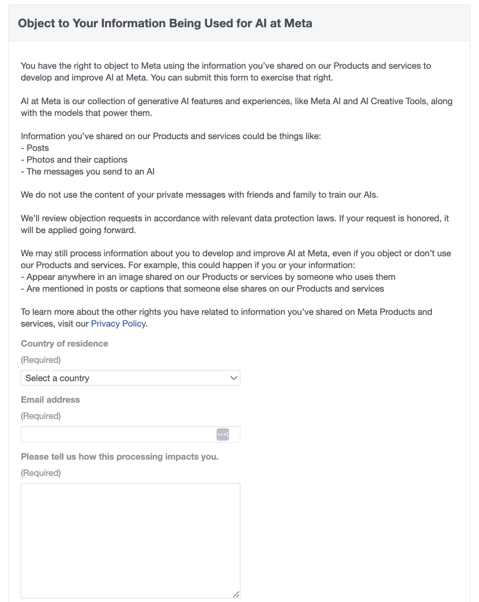 This then takes you to another page that explains, badly (hello dark patterns), you have the right to object (while telling you to ignore it) - but Meta, with no explanation, chooses IF this is honoured. Click the RIGHT TO OBJECT hyperlink.