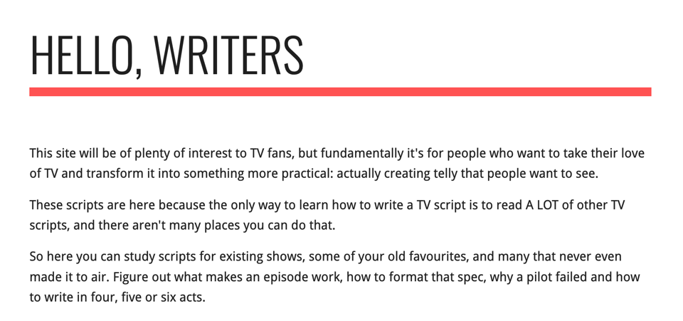 This TV writing website features FREE-TO-READ scripts for TV pilots and collections from the US and the UK covering everything from Fleabag to Sherlock and every Mad Men episode in-between.