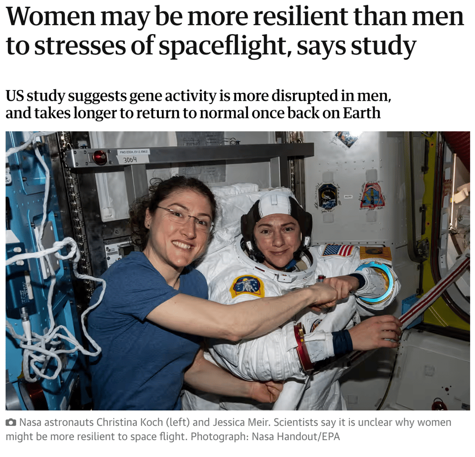 Well, what do you know. It turns out the child-carrying, patriarchy-surviving, sexism-enduring, home-making, hard-working, pain-resilient, man-flu avoiding half of our species might actually be better at handling the stresses of space travel.