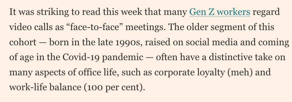 The FT on evidence-based generational ideas on ‘what is and what isn’t good for employees when it comes to WFH vs RTO’ is a good read.