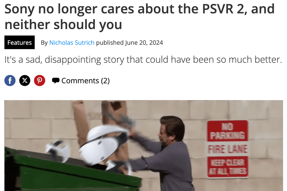 “I don’t think the people who bought a PSVR 2 expected it to be a paper weight a year later. You could argue they should have, given how poorly Sony supported the original PSVR, but even that headset had 34 exclusives. It seems unlikely the PSVR 2 will get even ten. Even in traditional gaming, exclusives are becoming a thing of the past, but the PSVR 2 is double the price of the Quest 3, and it's tethered. People bought it because they wanted to play PlayStation games, and if I was one of them I’d feel pretty scammed right now.”