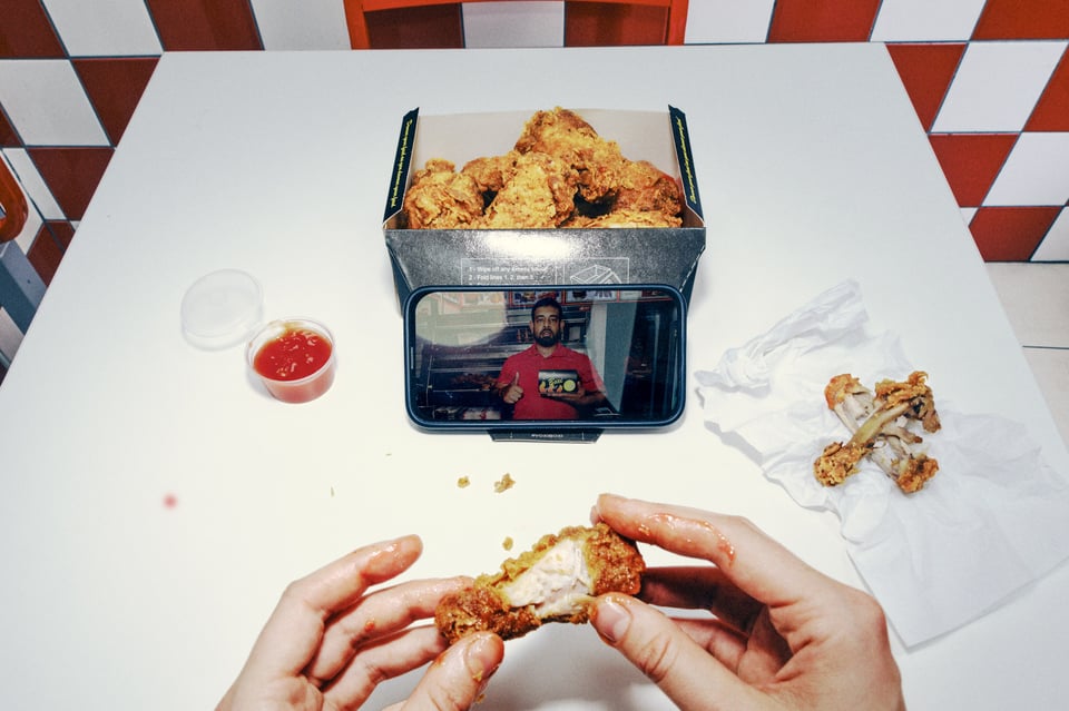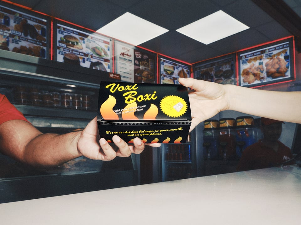 AMV BBDO and [youth-oriented mobile brand] VOXI have made 50,000 ‘Voxi Boxis’ and shipped them out to 50+ chicken shops across the country. Meaning you can carry on watching your social media while you enjoy your greasy wings.