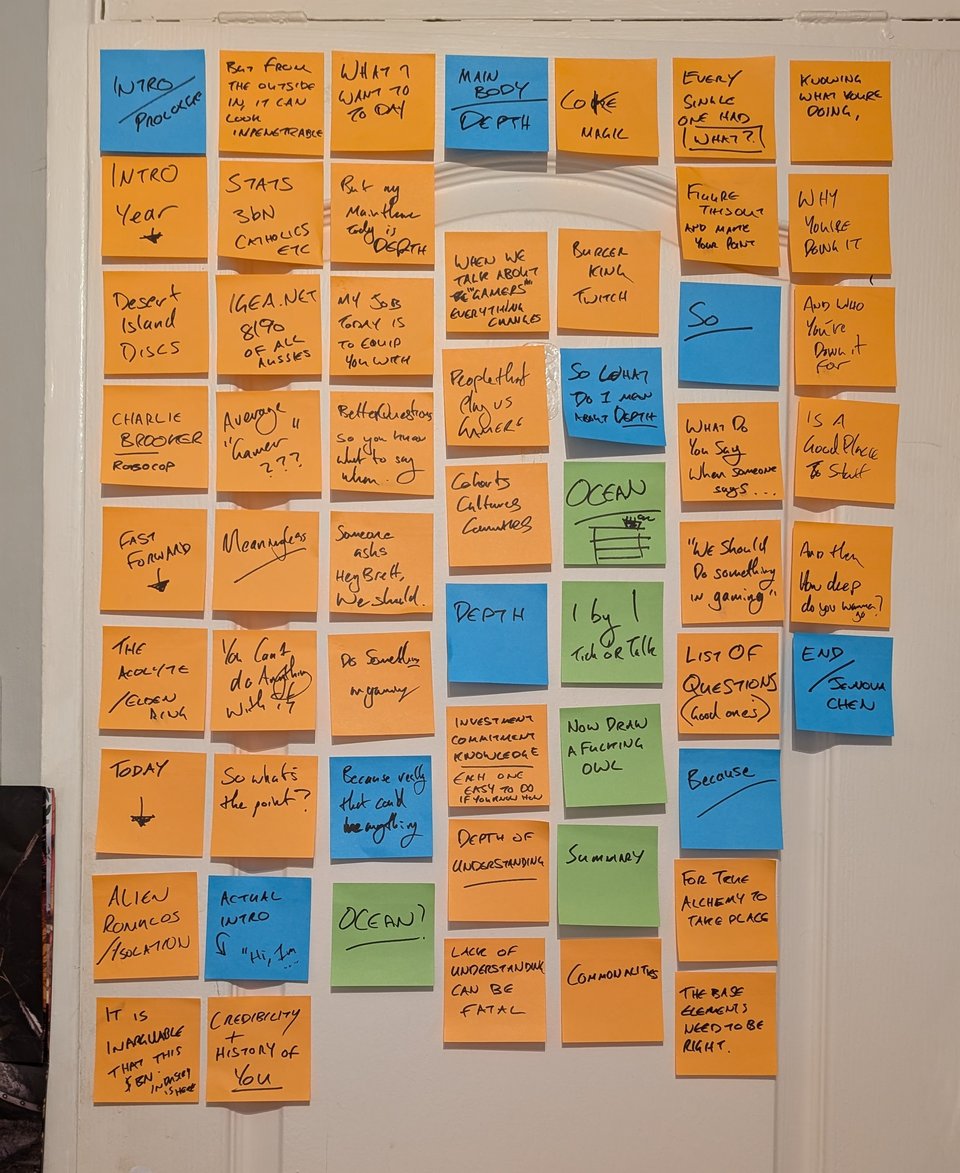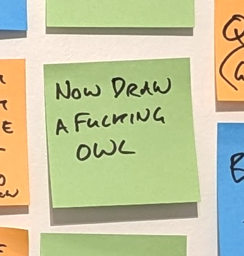 When you are the same person, let’s call him ‘Future James’ and you come to write up your deck skeleton, and you get to the ‘Draw the rest of the owl’ and you realise the central premise of your whole talk remains unwritten, well, you can kiss your evening goodbye. That one post-it note works out at around 60 slides of my presentation. RIP.