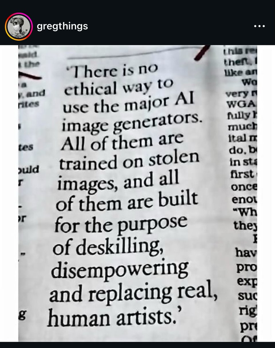 ‘There is no ethical way to use the major AI image generators. All of them are strained on stolen images, and all of them are built for the purpose of deskilling, disempowering and replacing real, human artists’