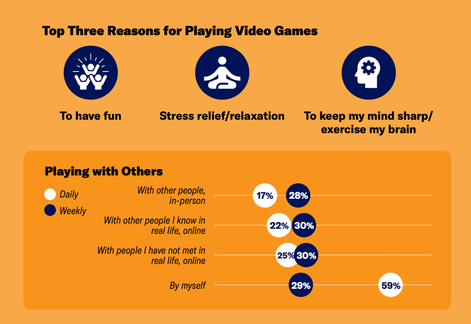 HAVING FUN is the top reason the world plays video games and learned that video games help players feel less stressed and help them get through difficult times. Players also recognise that video games develop skills such as problem-solving, teamwork, adaptability, and critical thinking.