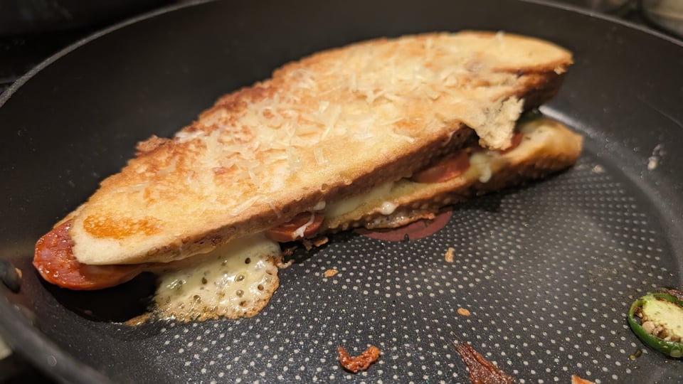 Chorizo, padron peppers, varying levels of cheese, crusty bread, buttered both sides, all gently pressed with a hot pan on top. My goodness me, I might make another today.