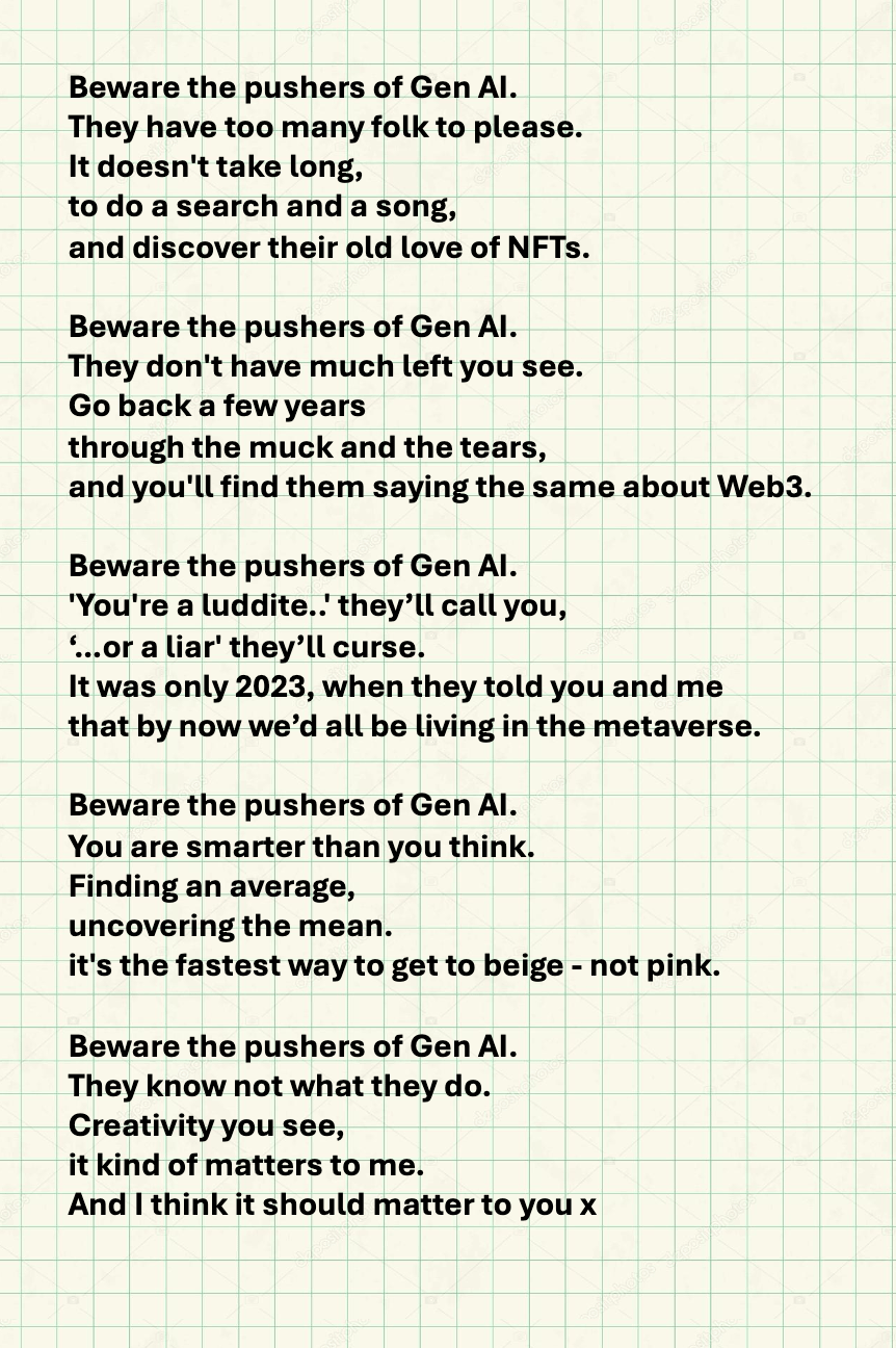 Actually, as an aside: I remember a dinner I went to in late 2024 talking about ‘‘the ethical use of generative ai’. Surrounded by people from music companies, publishers, and similar creative ‘thought leaders’. A children’s book author had uploaded THEIR ENTIRE MANUSCRIPT to ChatGPT to check for edits. The author told me this, having said they were dead against AI, but the act of uploading it had basically given the book away. Even then I said to them, stunned: ‘wow - the utility of the platform has outweighed any morality you had against it’.